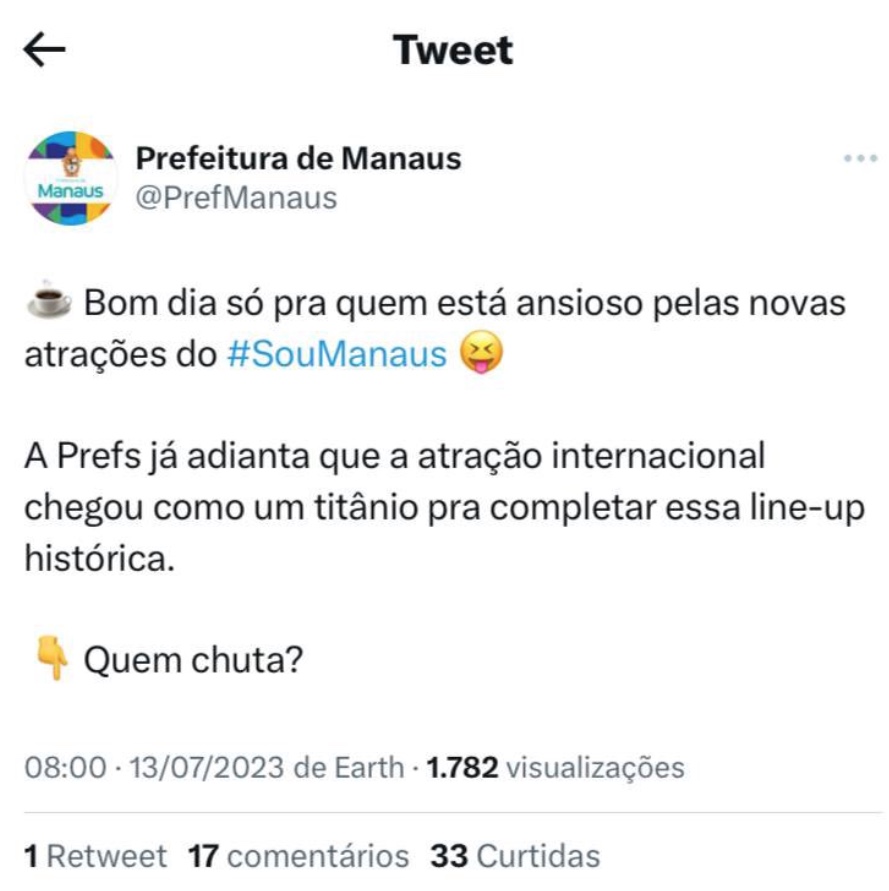Manaus/AM - O prefeito David Almeida (Avante) realizou o lançamento oficial do Festival Sou Manaus - Passo a Paço, na noite de quinta-feira (13), mas o anúncio da mega-atração internacional não aconteceu. Desde o início da semana a prefeitura intensificou a informação de que a atração internacional seria anunciada na data.