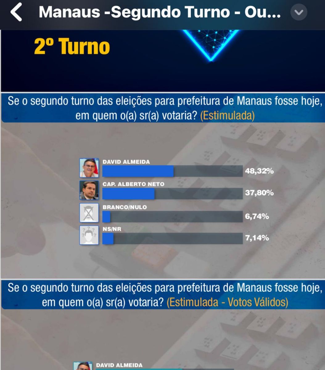 Manaus/AM - Pesquisa eleitoral realizada entre os dias 12 e 13 de outubro pela Projeta, Mercado e Opinião Pública, aponta que o candidato David Almeida, do Avante, ganharia a eleição para a Prefeitura de Manaus com 48 % das intenções de voto, contra 37% para Alberto Neto.