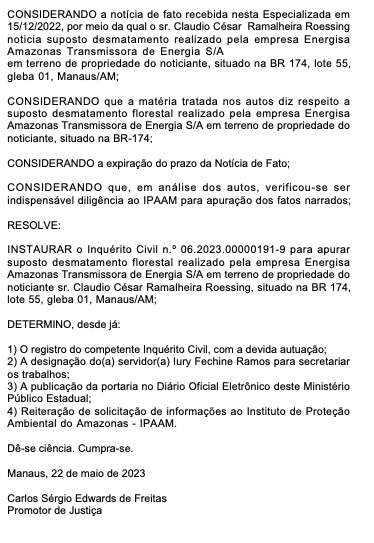 O procurador de Justiça Carlos Sérgio Freitas determinou a abertura de inquérito civil para apurar a denúncia do desembargador. Ele solicitou informações do Instituto de Proteção Ambiental do Amazonas (Ipaam).