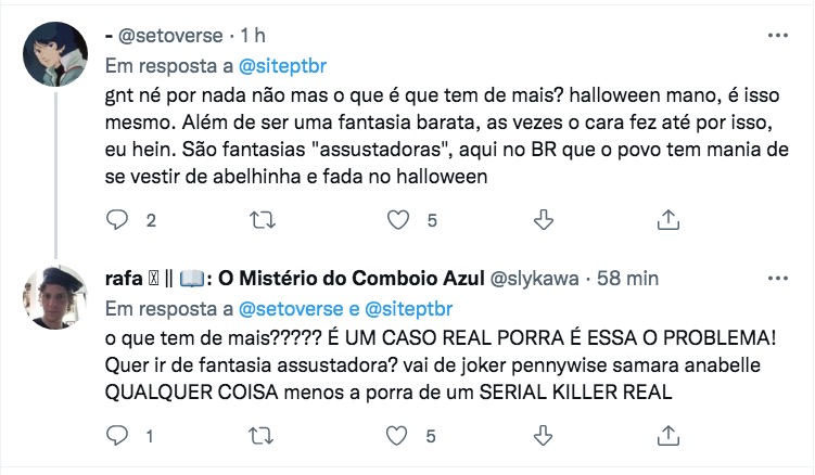 “Quem se fantasia de serial killer sempre é criticado, é de uma falta de noção enorme fazer isso mesmo sabendo que vai afetar as famílias das vítimas”, comentou um internauta.