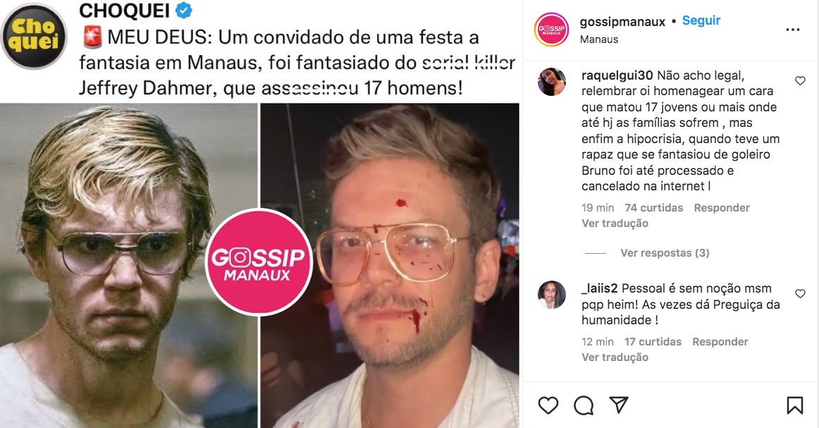 “O problema não é se vestir de mais um monstro. O problema é que ele causou dor e muito sofrimento pra famílias que estão vivas, que ainda lidam com o horror dessa perda. Então é de extrema falta de noção e empatia se vestir assim. Jason, fred, drácula não destruíram famílias reais”, pontuou outro.