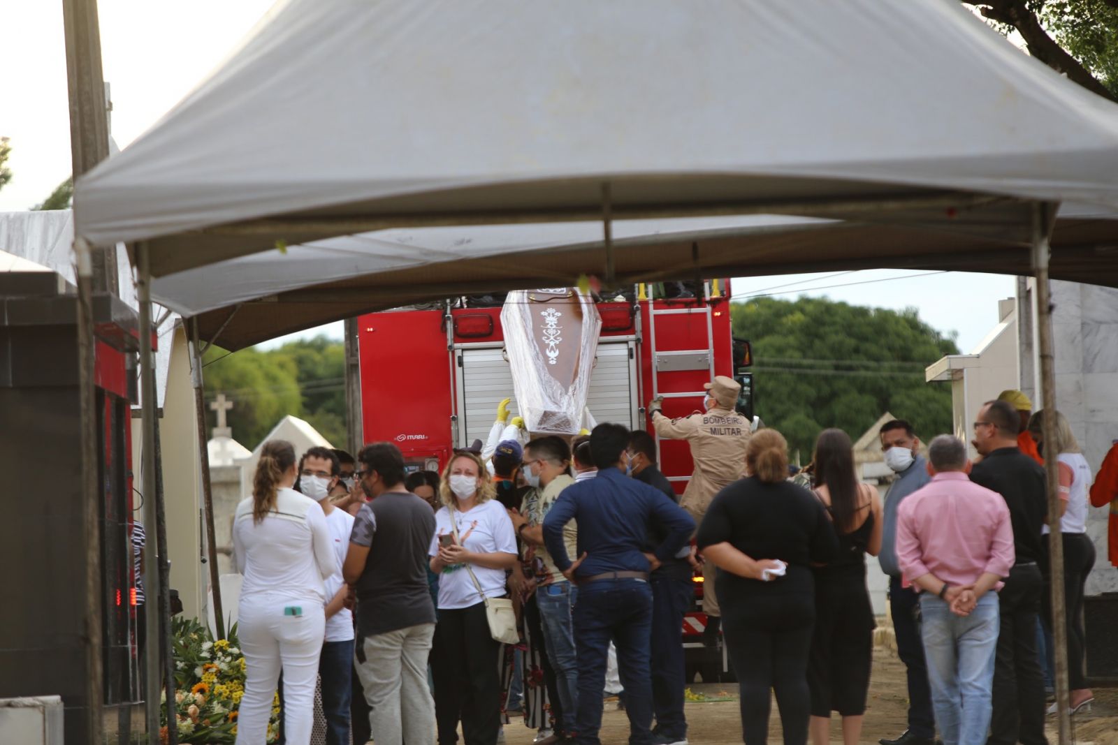 Um caminhão do corpo de bombeiros foi quem levou o corpo do cantor ao local, que foi recebido com aplausos por admiradores. Confira imagens do enterro do cantor: