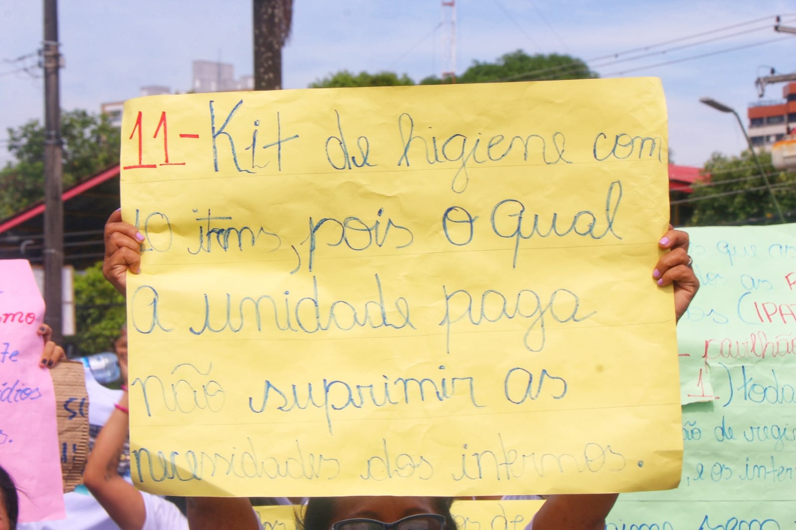 Os manifestantes estavam com camisa personalizada e traziam faixas e cartazes pedindo kits de higiene aos presos, visita do Ministério Público, fim da opressão dentro dos presídios e pessoas capacitadas no Raios X. “Somos humilhadas durante a revista porque as pessoas não sabem diferenciar um corpo estranho”, disse outra mulher.
