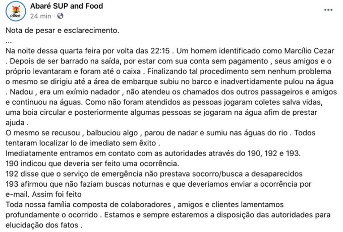 Manaus/AM - O flutuante Abaré Sup emitiu uma nota nessa quinta-feira (24), para explicar como o fuzileiro Marcílio Cezar, 26, desapareceu enquanto estava com um grupo de amigos no estabelecimento.