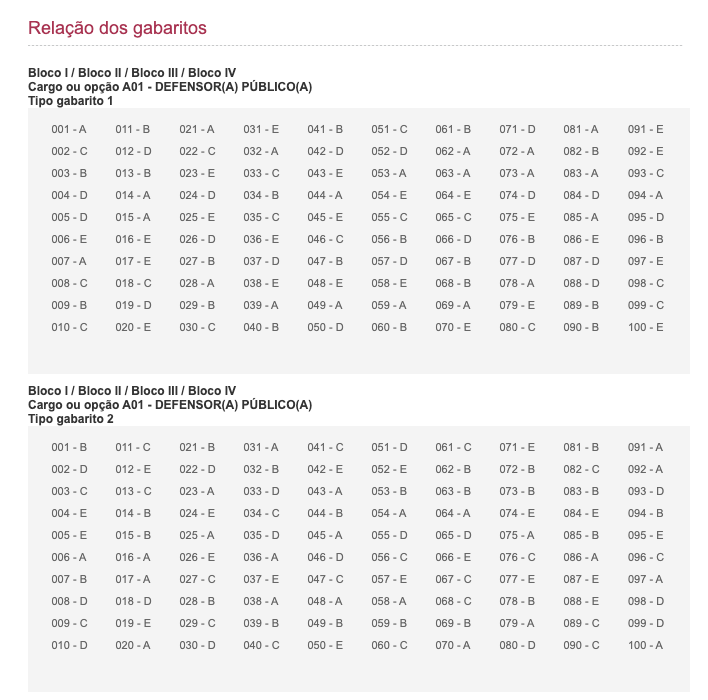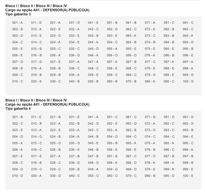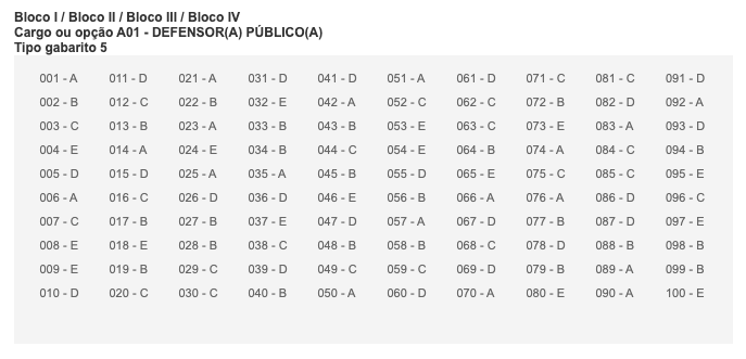 Confira abaixo os gabaritos de acordo com o tipo de prova;