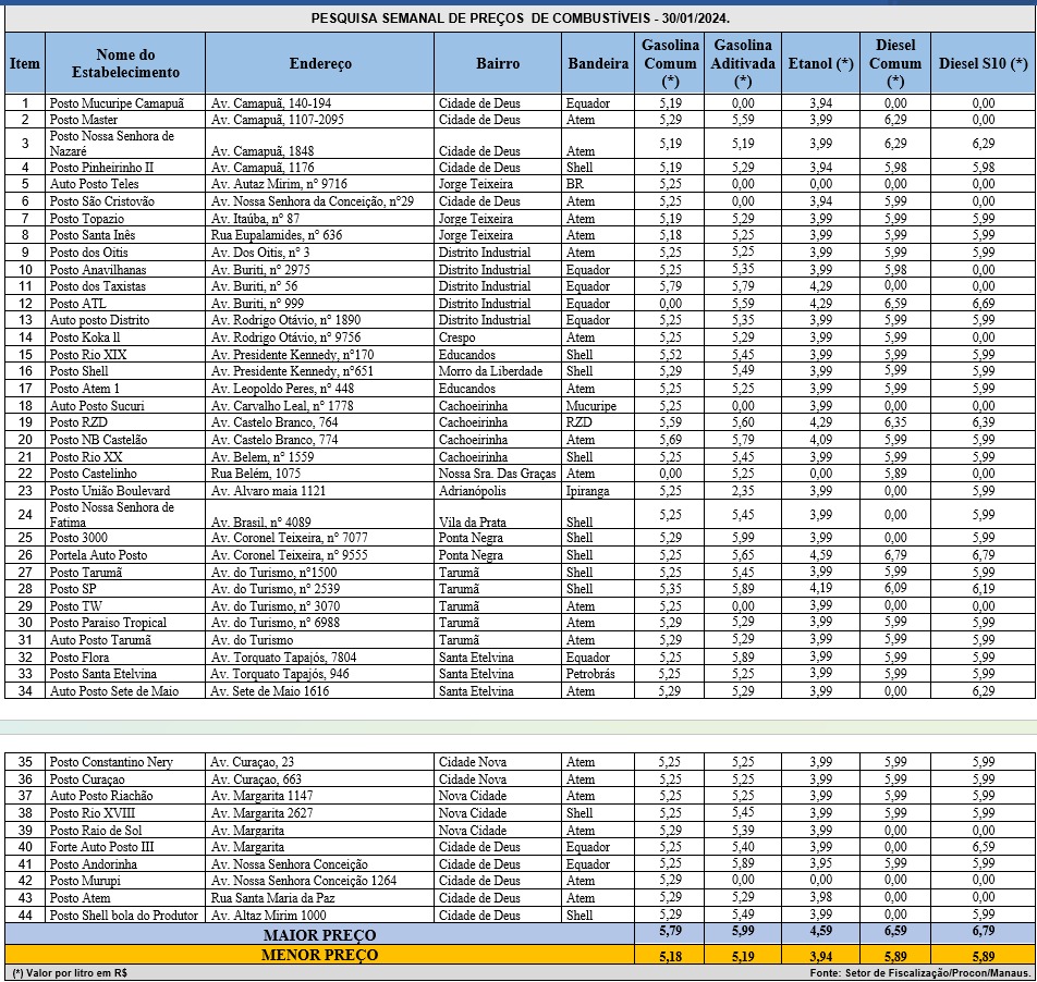 Manaus/AM - Serviço de Atendimento e Proteção ao Consumidor (Procon Manaus), divulgou nesta terça-feira (30), o resultado semanal da pesquisa de preços de combustíveis na cidade, em conformidade com a Lei nº 8.078/90 (Código de Defesa do Consumidor – CDC) em seus Artigos 4º e 6º, incisos II e III, que incentiva a promoção da livre concorrência, além de coibir as práticas de infrações à ordem econômica praticados no mercado como, por exemplo, o cartel de preços.