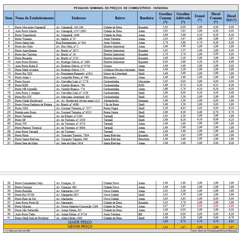 Manaus/AM - O Serviço de Atendimento e Proteção ao Consumidor (Procon Manaus), divulgou, nesta quinta-feira (15), os resultados da última pesquisa sobre os preços de combustíveis na região, revelando diminuição no valor, em comparação com a última pesquisa.