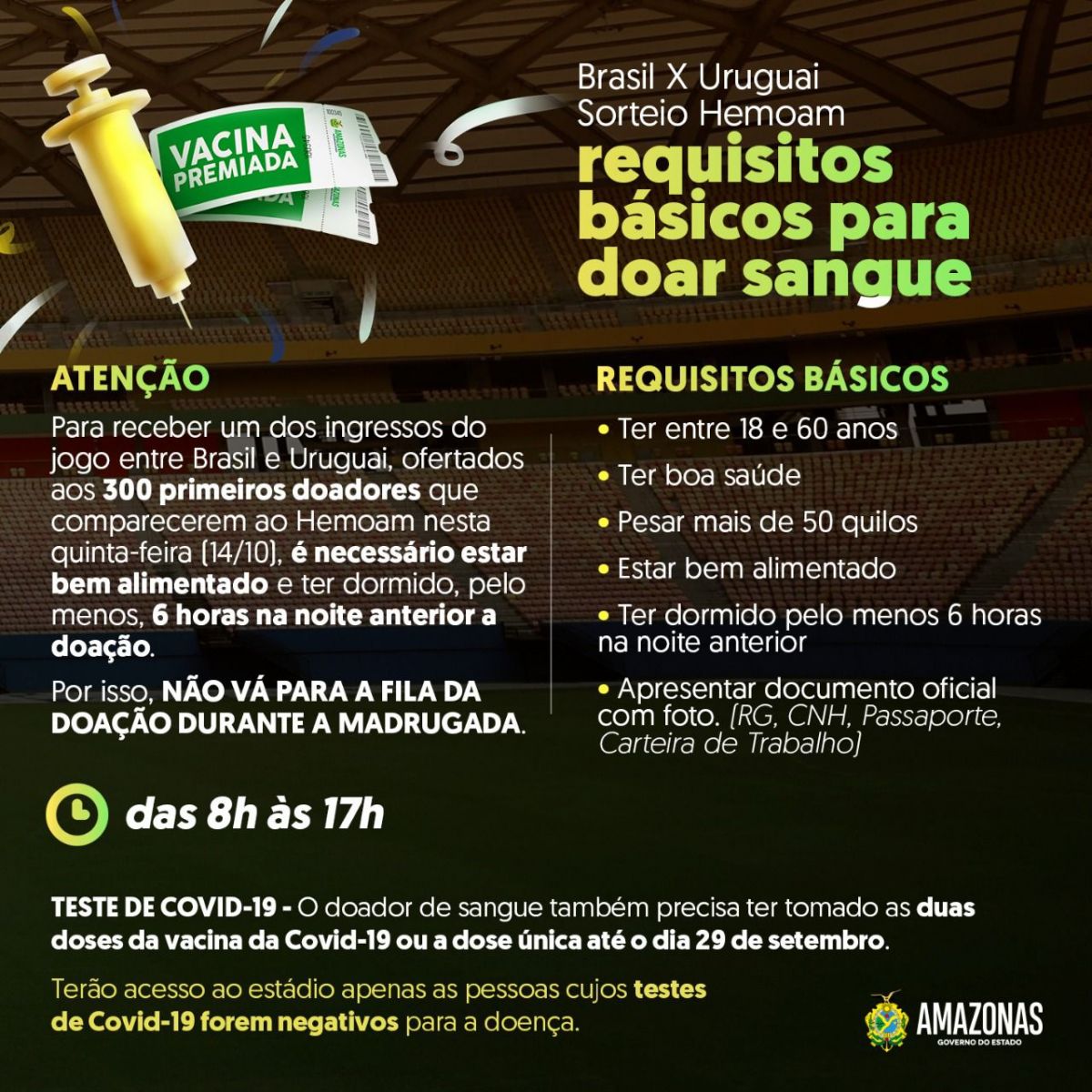 Manaus/AM - A Fundação de Hematologia e Hemoterapia do Amazonas (Fhemoam) anunciou, na madrugada desta quinta-feira (14), os critérios para ganhar ingresso para o jogo Brasil x Uruguai, na Arena da Amazônia.