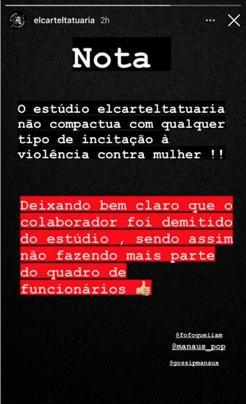 O estúdio de tatuagem em que trabalhava anunciou nesta terça-feira (2), que Rodrigo não faz mais parte da equipe. “O estúdio não compactua com qualquer tipo de incitação à violência contra a mulher. Deixando bem claro que o colaborador foi demitido do estúdio, sendo assim, não fazendo mais parte do quadro de funcionários”, informaram.