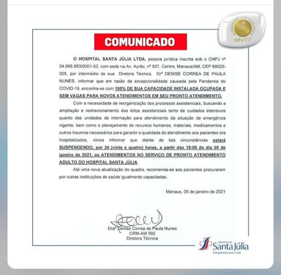 Manaus/AM - O Hospital Santa Júlia suspendeu, por 24 horas, o atendimento no serviço de pronto atendimento adulto após ocupação de 100% dos leitos devido a pandemia do novo coronavírus.