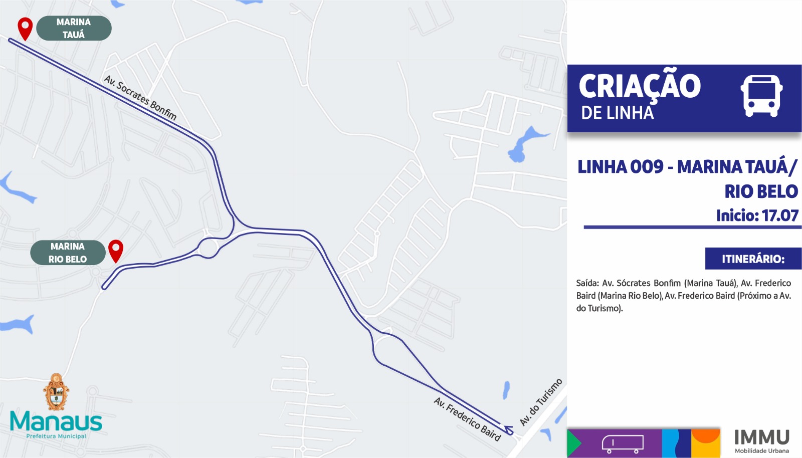 Manaus/AM - O Instituto Municipal de Mobilidade Urbana (IMMU) informa que, a partir da próxima segunda-feira (17), haverá alteração no itinerário da linha de ônibus 006 e será criada a linha 009 para atender os usuários da região do bairro Tarumã, zona Oeste de Manaus.