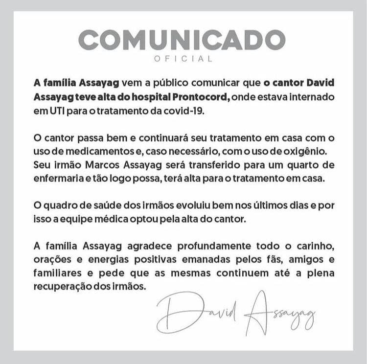 "A família Assayag agradece profundamente todo o carinho, orações e energias positivas emanadas pelos fãs, amigos e familiares e pede que as mesmas continuem até a plena recuperação dos irnãos", diz o comunicado.