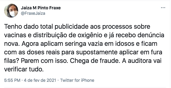 “Tenho dado total publicidade aos processos sobre vacinas e distribuição de oxigênio e já recebo denúncia nova. Agora aplicam seringa vazia em idosos e ficam com as doses reais para supostamente aplicar em fura filas? Parem com isso. Chega de fraude. A auditora vai verificar tudo”, disse Jaiza no Twitter.