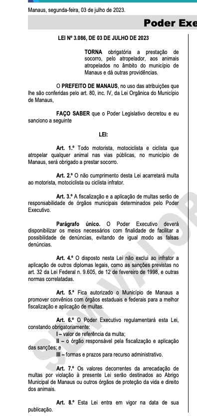 Manaus/AM - A Lei nº 3.086/2023 que obriga a prestação de socorro a animais atropelados em Manaus já está em vigor desde esta segunda-feira (3), após sanção do prefeito David Almeida. A regra deve ser respeitada por motoristas, motociclistas e ciclistas.