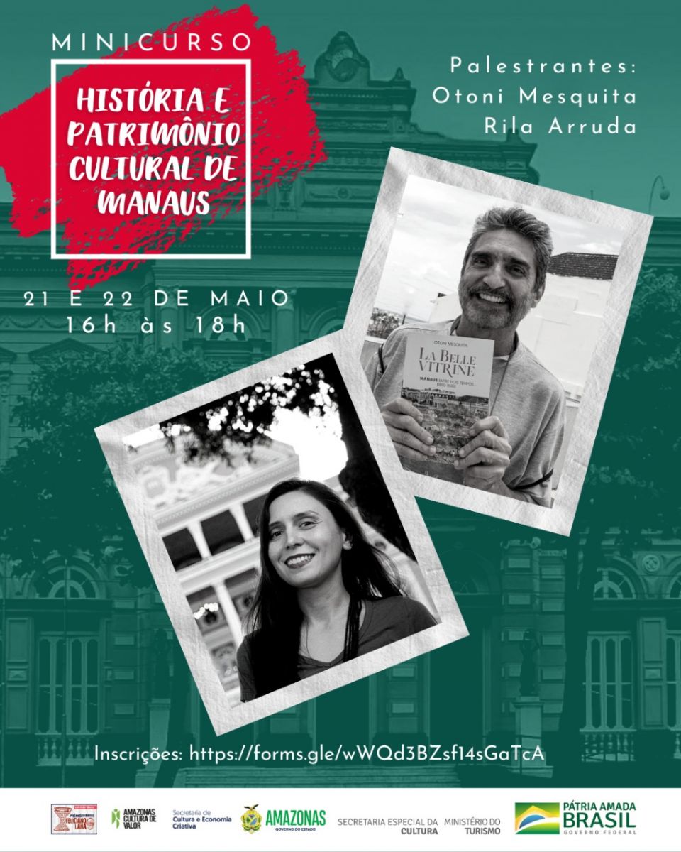 Manaus/AM - As inscrições para o minicurso de História e Patrimônio Cultural de Manaus, coordenado pela cientista social Rila Arruda em parceria com o historiador Otoni Mesquita estão abertas. As aulas serão realizadas durante a 19ª Semana Nacional de Museus, nos dias 21 e 22 de maio, sexta e sábado, das 16 às 18 horas. O pré-requisito para participar é ter o ensino médio completo ou cursando o ensino superior, ao final será disponibilizada uma declaração para o participante. As inscrições são gratuitas.