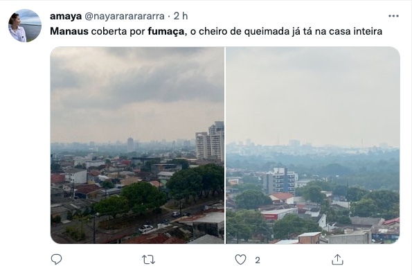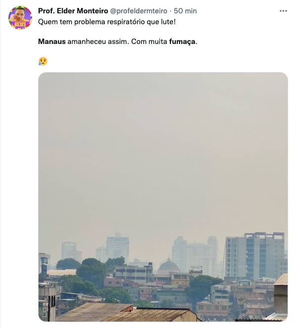 Uma ventania que atinge o Amazonas está trazendo a fumaça das queimadas da região Sul e Sudeste do estado, e também do Oeste do Pará, para a Região Metropolitana de Manaus. Moradores da capital comentaram no twitter sobre o céu cinza e o cheiro forte que se espalhou.