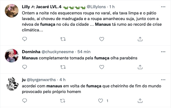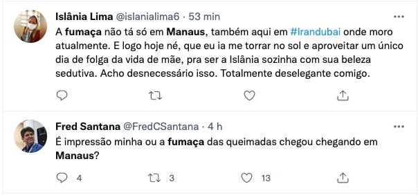 No twitter, moradores relataram sobre a fumaça que invadiu algumas casas. Uma moradora de Iranduba também comentou sobre a situação.