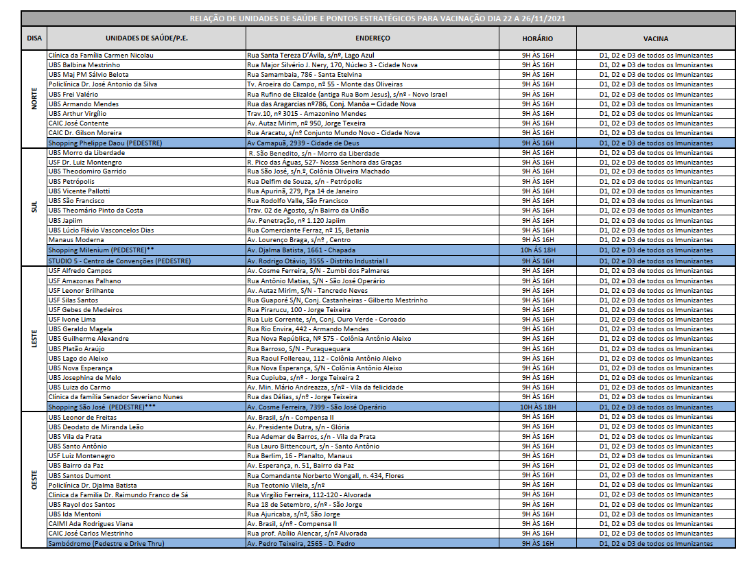 Manaus/AM - A vacinação contra a Covid-19, nesta sexta-feira (26), continuará em 52 pontos distribuídos pela cidade. Além das unidades de saúde, haverá atendimento na feira Manaus Moderna, nos locais classificados como estratégicos, incluindo o retorno dos pontos do Sambódromo e do Studio 5 Centro de Convenções, além de dois shoppings, o Millenium e o São José.
