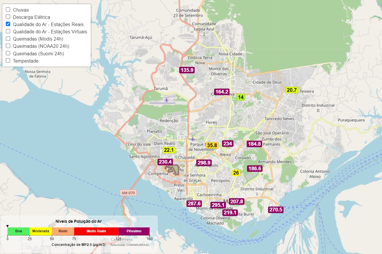 De acordo com o sistema World's Air Pollution, que mostra em tempo real a qualidade do ar em todo o planeta, Manaus está em situação perigosa com 319 micro organismos poluentes por metro cúbico no ar.