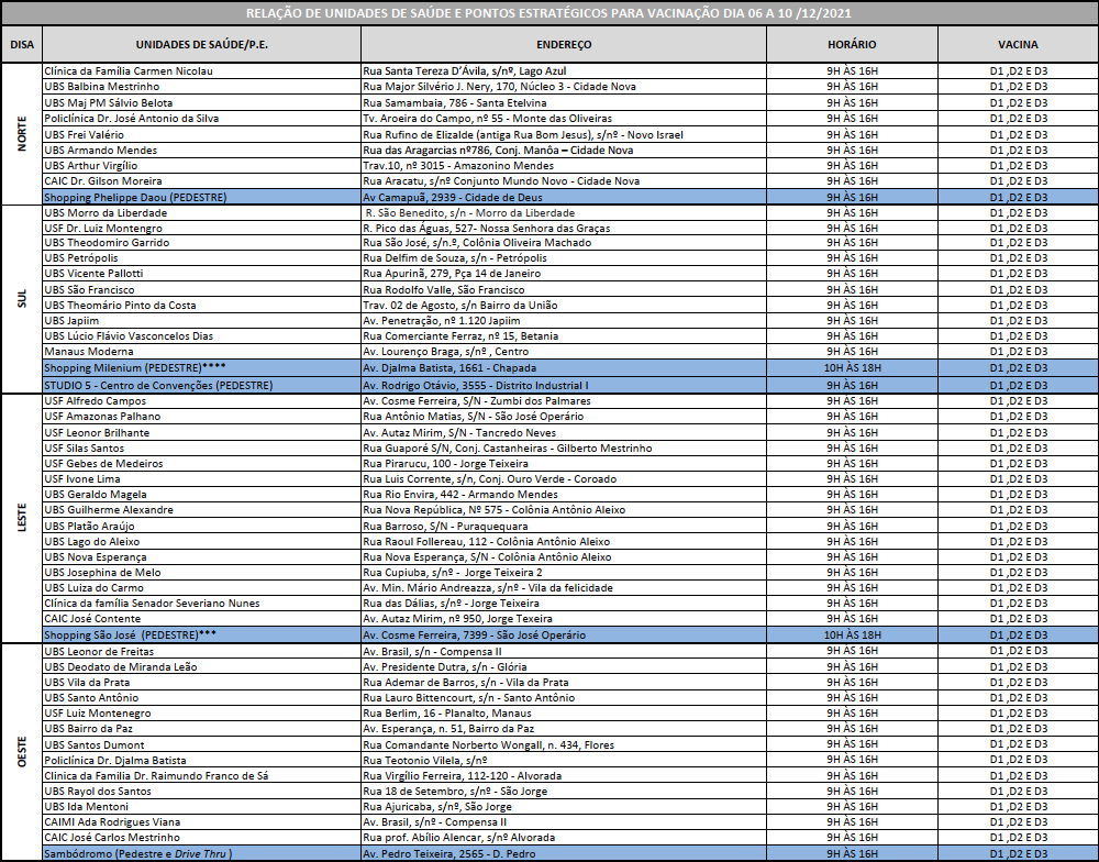Entre os locais, estão unidades de saúde, pontos estratégicos, Centros de Atenção Integral à Criança (Caic) e de Atenção Integral à Melhor Idade (Caimi), feira Manaus Moderna e seis shoppings, que retomam a aplicação de doses nesta quinta-feira. O ponto de vacinação do shopping Millenium passará a atender somente de segunda à quarta-feira.