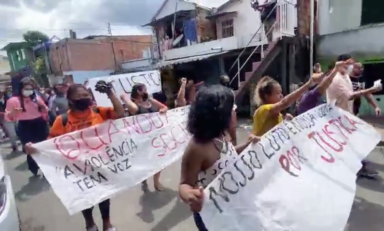 Manaus/AM - Familiares e amigos de Melquesedeque dos Santos, 20, se reúnem em protesto na frente da igreja onde o corpo está sendo velado na rua Glauber Rocha, no bairro Compensa, na Zona Oeste.