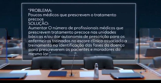 "Problema: Poucos médicos que prescrevem o tratamento precoce. Solução: Aumentar o número de profissionais médicos que prescrevem tratamento precoce nas unidades básicas e/ou dar autonomia de prescrição para os enfermeiros treinados no escore clínico associado a treinamento na identificação das fases da doença para prescreverem os pacientes e moradores do mesmo lar".