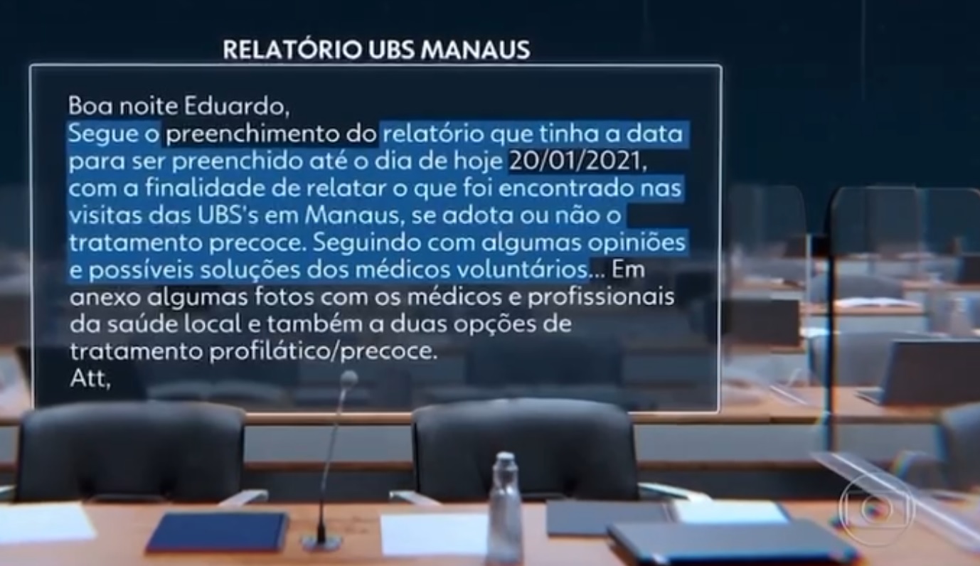 Mayra Pinheiro coordenou a operação, e após alguns dias em Manaus, os médicos mandaram um relatório, no dia 20 de janeiro, a ela e ao secretário de Ciência, Tecnologia, Inovação e Insumos Estratégicos em Saúde, Hélio Angotti. “Segue o relatório que tinha a data para ser preenchido até o dia de hoje, com a finalidade de relatar o que foi encontrado nas visitas das UBSs em Manaus, se adota ou não o tratamento precoce. Seguindo com algumas opiniões e possíveis soluções dos médicos voluntários”, afirma o técnico do ministério, no documento sob o título de “Relatório UBS Manaus”.