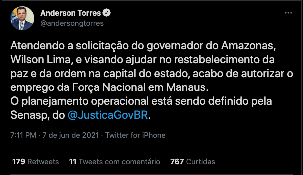 "Atendendo a solicitação do governador do Amazonas, Wilson Lima, e visando ajudar no restabelecimento da paz e da ordem na capital do estado, acabo de autorizar o emprego da Força Nacional em Manaus. O planejamento operacional está sendo definido pela Senasp, do @JusticaGovBR", escreveu ele no Twitter.