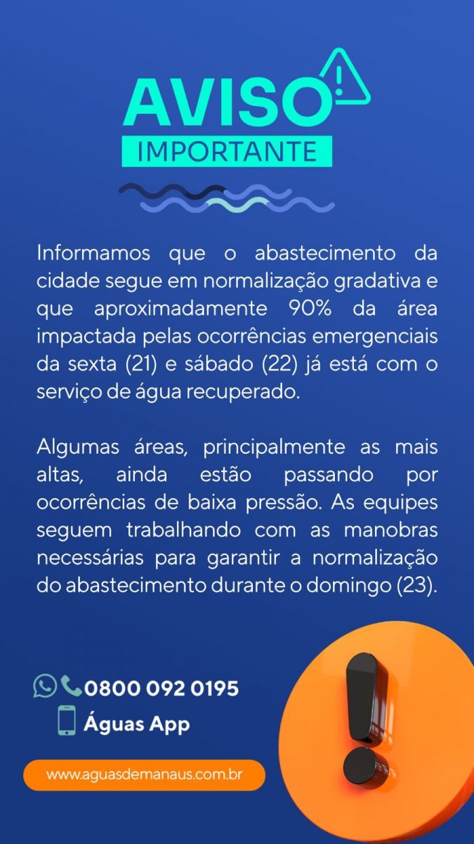 Em nota, a Águas de Manaus informou que, até por volta das 16h30 de hoje, cerca de 10% dos bairros impactados ainda estavam sem água. "Aqui na Cachoeirinha, nada de água e para variar, ainda estamos sem energia nesse calor", disse um morador que preferiu não se identificar.