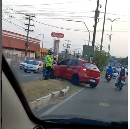 Manaus/AM - Um carro de passeio ficou preso no canteiro central da avenida Torquato Tapajós na manhã de hoje (19), ao tentar fazer uma manobra de retorno proibido no local.