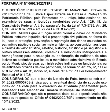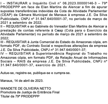 Manaus/AM - O Ministério Público do Amazonas (MPAM) abriu inquérito para investigar o vereador Elan Alencar, que é suspeito de usar quase R$ 150 mil da Cota de Exercício para Atividade Parlamentar, o “Cotão”, para bancar o próprio site de notícias em Manaus. O inquérito foi instaurado pela promotora Wandete Netto após o vereador não responder ofício para se explicar sobre o caso.