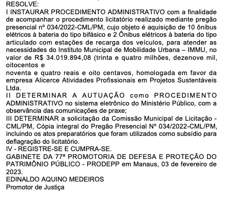 Manaus/AM - O Ministério Público do Amazonas (MP-AM) abriu Procedimento Administrativo para acompanhar o processo licitatório da Prefeitura de Manaus para aquisição de 12 ônibus elétricos, pelo valor total de R$ 34.019.894,08. O promotor Edinaldo Medeiros determinou a instauração do procedimento no último dia 3, conforme portaria publicada no Diário Oficial Eletrônico do MP-AM dessa terça-feira (7).