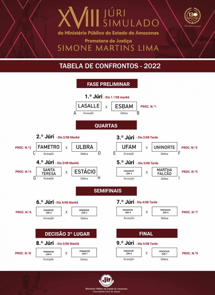 Confira o chaveamento do XVIII Concurso de Júri Simulado do MPAM: