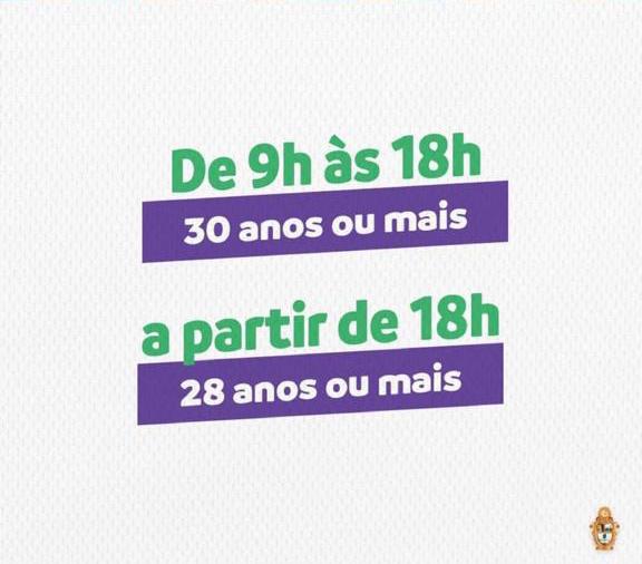 O público a ser atendido ao longo do dia será o de 30 anos ou mais e, a partir das 18h, passam a ser contemplados os de 28 anos ou mais.