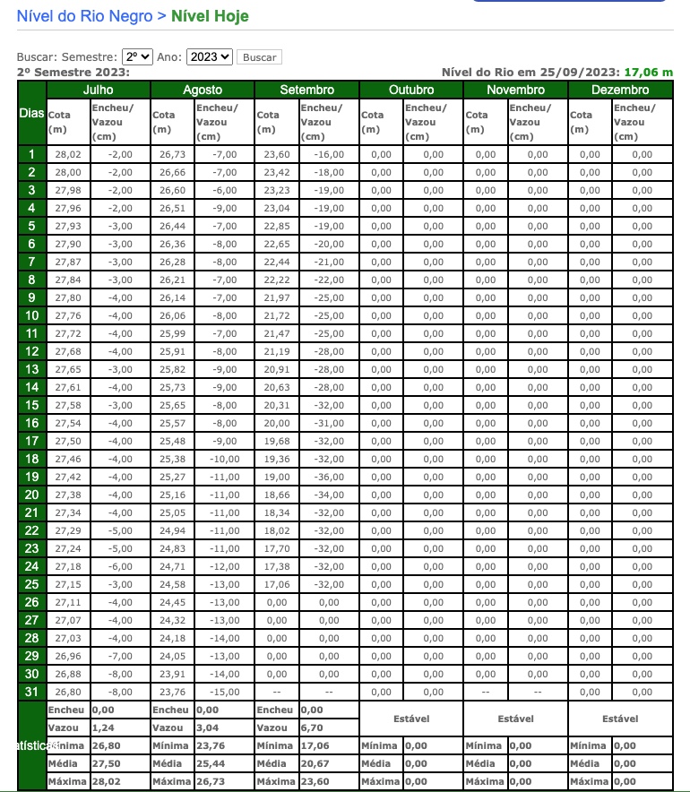 Manaus/AM - O nível do Rio Negro desce de forma acelerada neste mês de setembro, conforme medição realizada no Porto de Manaus. O período de estiagem se mostra mais forte para o mês, com vazante alcançando média diária de 32cm nos últimos 10 dias.