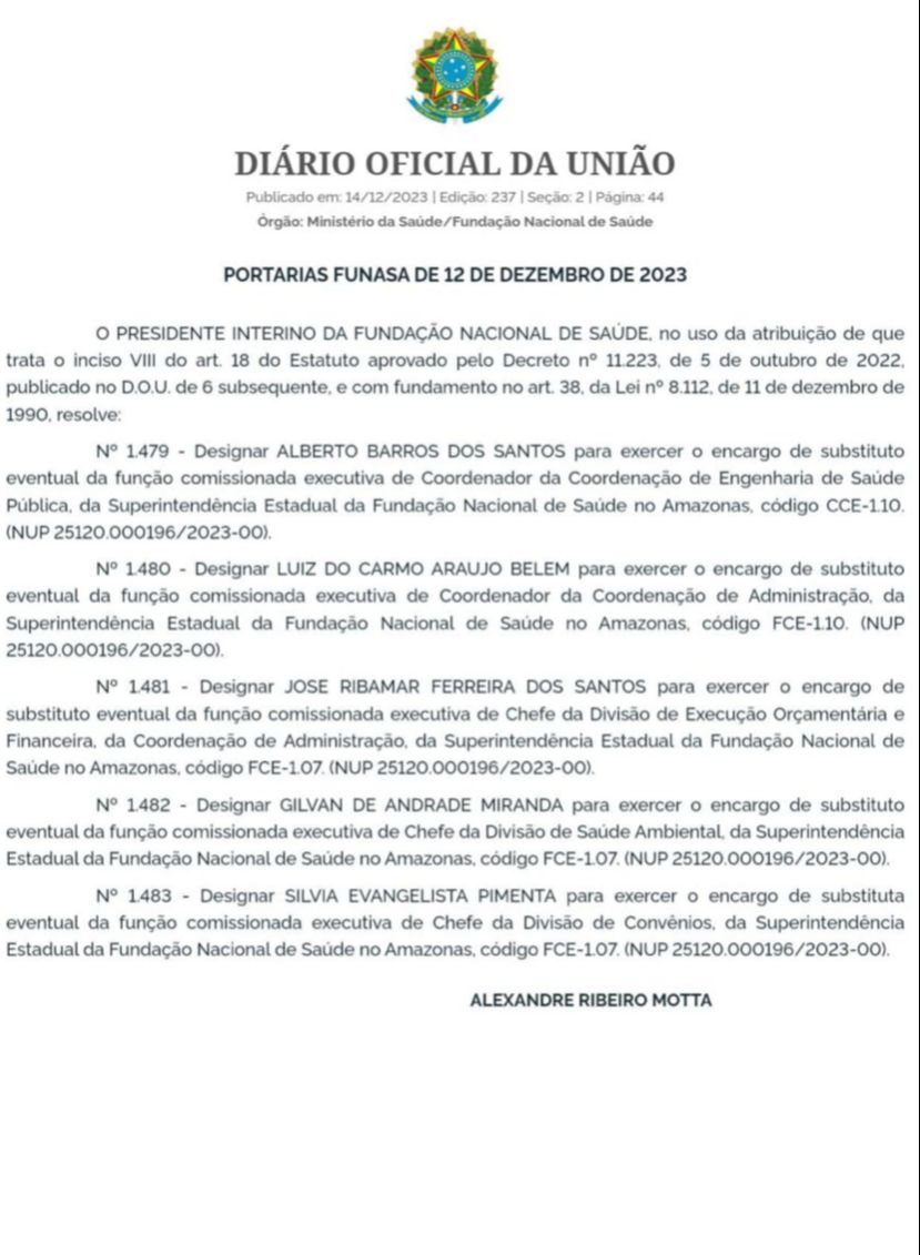 Manaus/AM - O presidente interino da Fundação Nacional de Saúde (Funasa), Alexandre Ribeiro Motta, nomeou cinco novos coordenadores. Entre os novos designados está Alberto Barros dos Santos para exercer o encargo de substituto eventual da função comissionada executiva de Coordenador de Coordenação de Engenharia de Saúde Pública, da Superintendência Estadual da Fundação Nacional de Saúde no Amazonas. A informação consta na edição desta quinta-feira (14) do Diário Oficial da União (DOU).