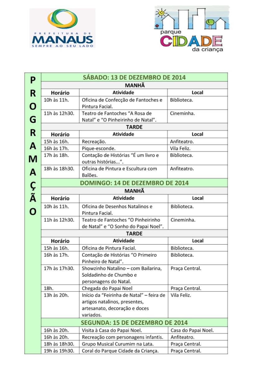 Quem for ao Parque Cidade da Criança neste fim de semana vai encontrar o espaço todo em clima natalino e com uma programação especial que terá seu ápice no domingo, 14, com a tradicional chegada do Papai Noel, que estará em sua casa recebendo o pedido das crianças. A chegada do bom velhinho está programada para às 18h e sua casa, preparada para receber as crianças, contará com uma decoração que inclui até chaminé e ceia de natal. A diretora do parque, Socorro Andrade, explicou que a programação já está planejada. “Nós preparamos um show com músicas natalinas e com personagens vivos, como biscoito de Natal, boneco de neve, árvore de Natal, que vão interagir com as crianças e o público presente”, explicou. No sábado, a partir das 10h, haverá uma oficina de Confecção de Fantoches e Pintura Facial e, em seguida, Teatro de Fantoches com as histórias “A Rosa de Natal” e o “Pinheirinho de Natal”. A tarde haverá contação de histórias e oficina de pinturas e esculturas com balões. O Parque também abriu espaço para o Clube de Mães da Oficina de Artesanato Porto de Luz, que vai expor seus produtos na Feirinha de Natal, a partir de domingo, 14, até o dia 23. A exposição será na Vila Feliz e diária. Recentemente o parque, gerenciado pela Fundação Municipal de Cultura, Turismo e Eventos (Manauscult), passou por um processo de revitalização completo, que incluiu pintura, serviços de jardinagem, iluminação e manutenção dos brinquedos. O parque Cidade da Criança está localizado na avenida André Araújo, com entrada pela rua Castro Alves, no bairro Aleixo, e está funcionando em horário especial, de segunda a sexta-feira, de 13h às 20h, e aos sábados e domingos, de 10h às 21h. Confira programação completa no anexo.