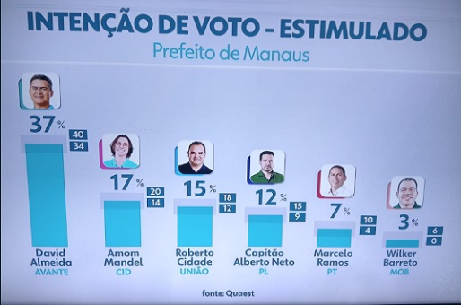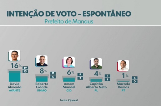 Neste cenário, David Almeida também é líder e aparece com 16% das intenções, o dobro do segundo colocado, Roberto Cidade, 8%. Amom Mandel aparece com 6%, Alberto Neto, com 4%, Marcelo Ramos, 1%, e Wilker Barreto, 0%.