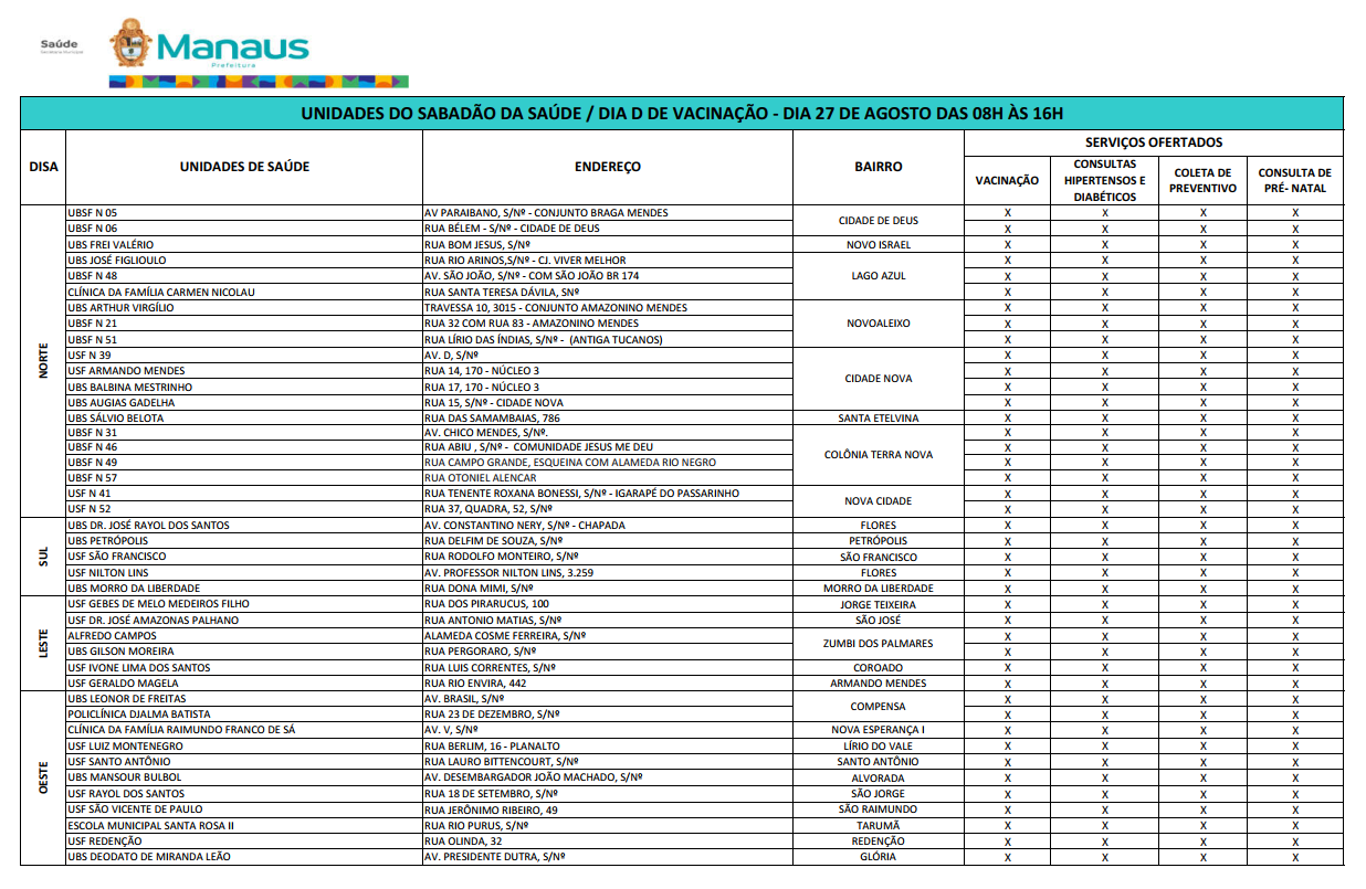 Manaus/AM - A última edição do “Sabadão da Saúde” acontecerá no próximo dia 27, com 42 Unidades Básicas de Saúde (UBS) abertas de 8h às 16h, intensificando a oferta de vários serviços. A estratégia da Secretaria Municipal de Saúde (Semsa) já superou a marca de 60 mil atendimentos nas três edições da iniciativa, realizadas neste mês de agosto.