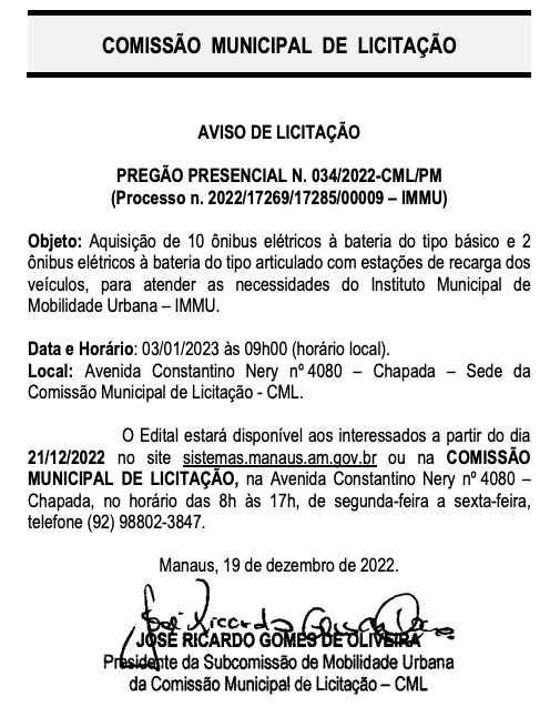 Manaus/AM - A Prefeitura de Manaus divulgou no Diário Oficial do Município desta segunda-feira (19), Aviso de Licitação para aquisição de 12 ônibus elétricos à bateria, sendo 10 do tipo básico e 2 veículos articulados. A licitação será realizada no dia 3 de janeiro de 2023, conforme o documento.