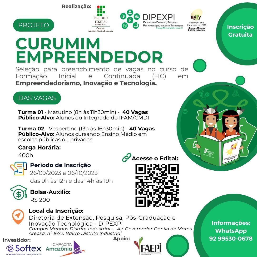 Manaus/AM - Em parceria com Softex Amazônia, a Fundação de Apoio ao Ensino, Pesquisa, Extensão e Interiorização do Instituto Federal do Amazonas lançou um edital disponibilizando 80 bolsas de estudos para o Projeto Curumim Empreendedor, com a oferta de duas turmas de Capacitação em Formação Inicial e Continuada em Empreendedorismo, Inovação e Tecnologia. As inscrições gratuitas podem ser feitas do dia 26 de setembro até dia 6 de outubro de 2023.