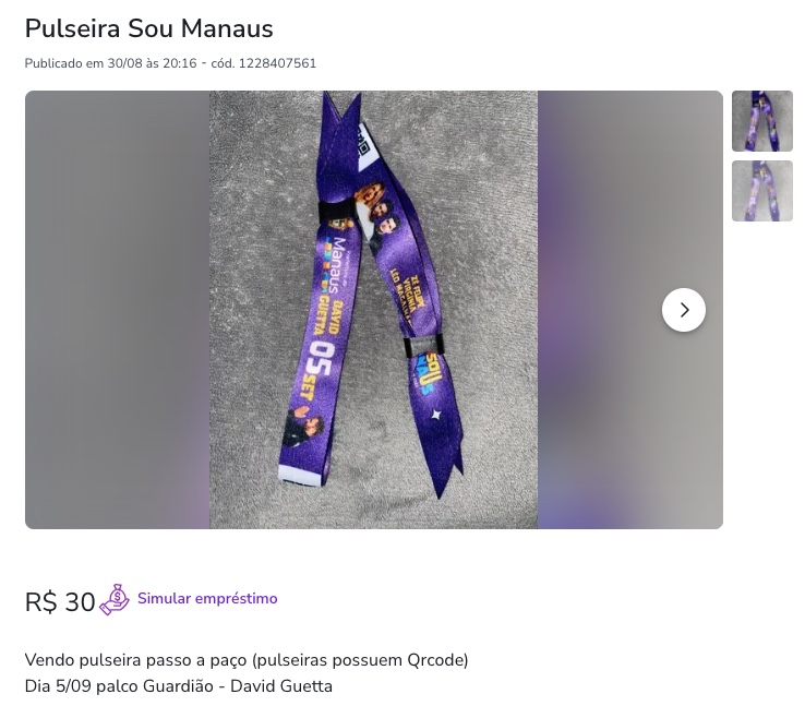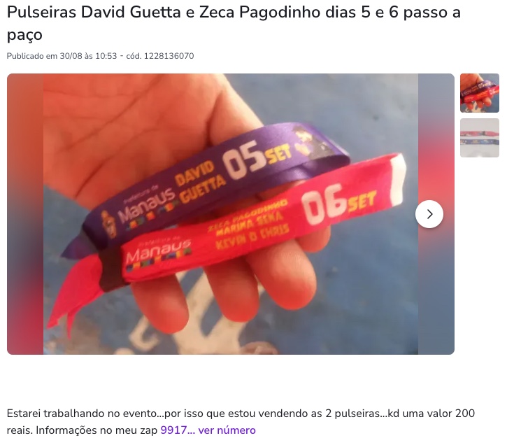 Manaus/AM - As pulseiras para acesso aos shows do festival Sou Manaus Passo a Paço 2023 estão sendo vendidas na internet. Com preços que variam entre R$ 30 a até R$ 400, as pulseiras estão sendo comercializadas em sites de vendas e nas redes sociais. A prática é considerada crime de cambismo.