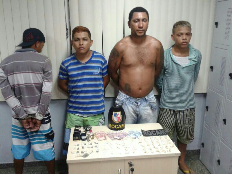 Policiais Militares da viatura 2009 da ROCAM detiveram Edmar Dos Santos, 25 anos, (ex-presidiário), Hito José Pereira Bastos, 18 anos, Lenilson dos Santos Oliveira, 28 anos, (ex-presidiário) e um menor de 17 anos. Com eles foram encontrados 29 trouxinhas pasta base, nove trouxinhas de cocaína em pó, treze trouxinhas de Oxi, doze trouxinhas de maconha, uma porção de 50 grama de maconha, R$ 97,50 em dinheiro e doios celulares. O quarteto foi preso na Rua da Multibrás, comunidade da Sharp no Bairro Armando Mendes. Os acusados foram encaminhados ao 9º DIP par