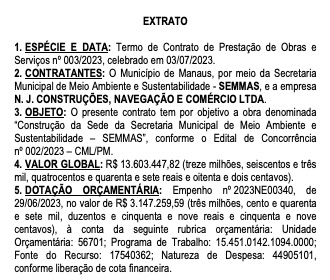 A empresa contratada foi a N. J. Construções, Navegação e Comércio Ltda, que tem prazo de 540 dias para concluir a obra, conforme o extrato do contrato publicado no Diário Oficial de Manaus, assinado pelo titular da Semmas, Antônio Stroski.