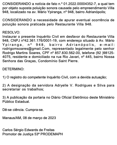 Manaus/AM - O Restaurante Villa 948, localizado na avenida Mário Ypiranga, na Zona Centro-Sul de Manaus, está na mira do Ministério Público do Amazonas (MPAM) por conta de denúncia de poluição sonora. Um inquérito foi aberto nesta semana para seguir com a investigação contra o estabelecimento.