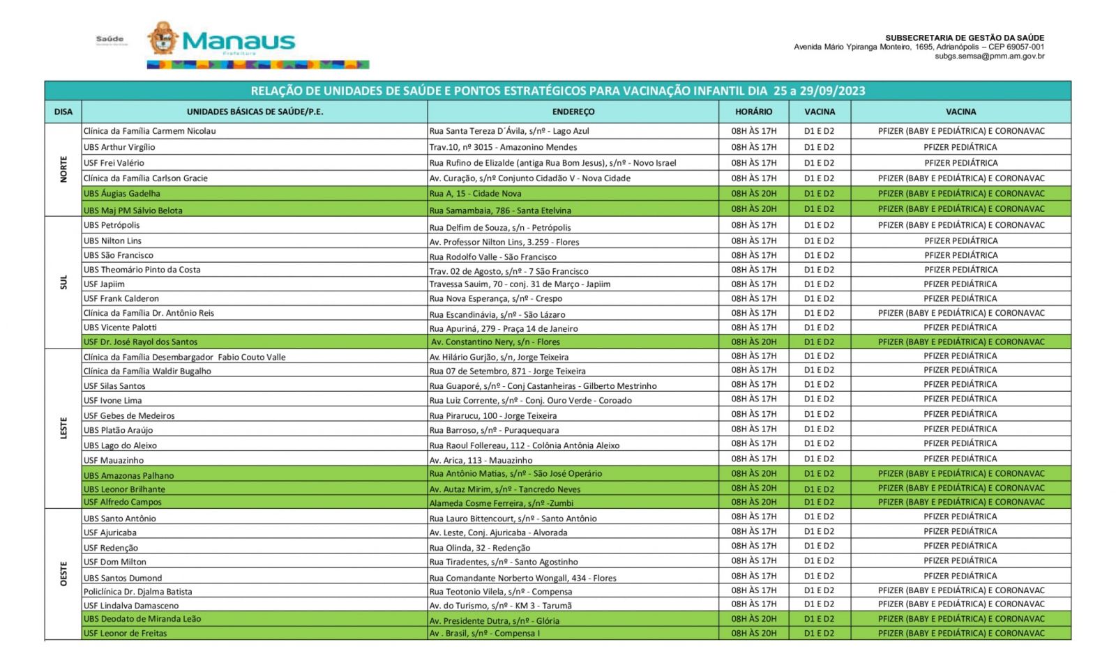 Os endereços e horários de funcionamento de cada unidade podem ser consultados pelo link: bit.ly/localvacinacovid19.