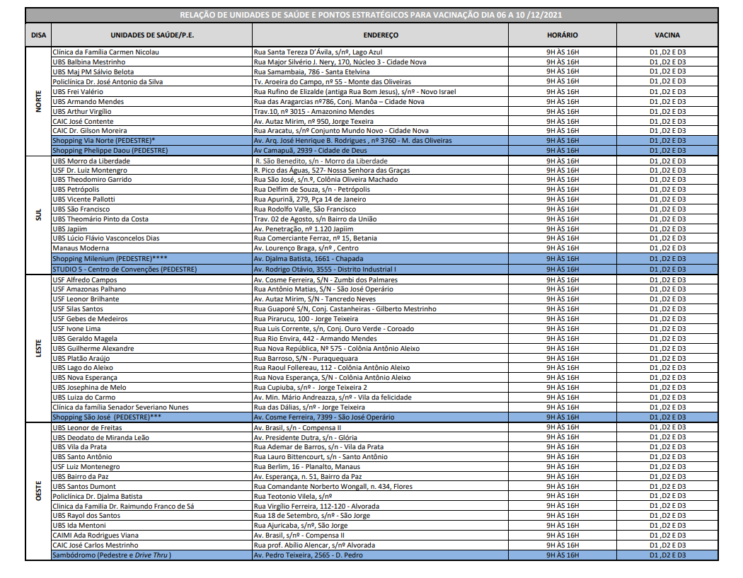 Manaus/AM - A vacinação contra a covid-19 avança nesta segunda-feira (6), e conta com 52 pontos de atendimento espalhados nas quatro zonas da cidade.