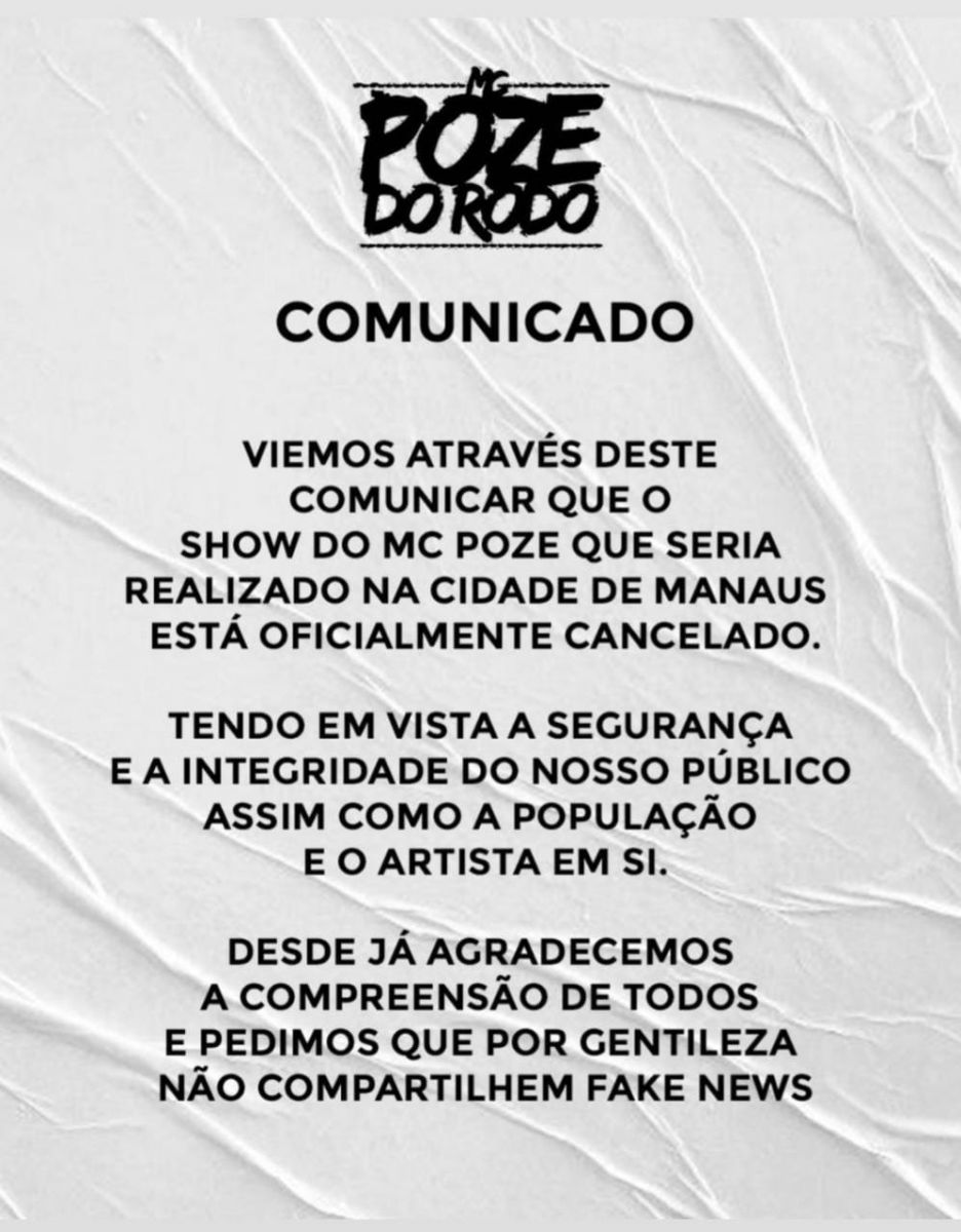 Manaus/AM - A casa de show Forró de Nós, que havia anunciado para o mês de outubro a atração nacional MC Poze, anunciou neste sábado (11), em suas redes sociais que o evento foi cancelado.