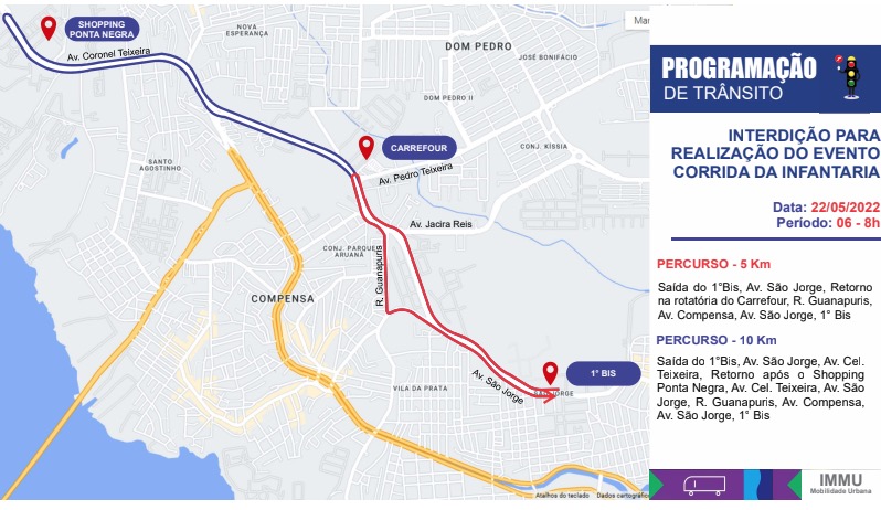 Manaus/AM - O Instituto Municipal de Mobilidade Urbana (IMMU), vai alterar parte do itinerário do trânsito e do transporte na avenida Coronel Teixeira, Zona Oeste, para a realização da Corrida da Infantaria 2022, neste domingo (22), entre 5h e 8h. Aproximadamente 50 agentes e fiscais de transportes estarão monitorando as vias que estão incluídas no itinerário.