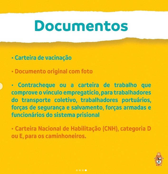 Para receber a vacina contra a gripe, é preciso apresentar a carteira de vacinação, um documento de identificação original, com foto, contracheque ou a carteira de trabalho, que comprove o vínculo empregatício (no caso dos professores, dos trabalhadores do transporte coletivo, trabalhadores portuários, forças de segurança e salvamento, Forças Armadas e funcionários do sistema prisional). Os caminhoneiros devem levar a Carteira Nacional de Habilitação (CNH), categoria D ou E.